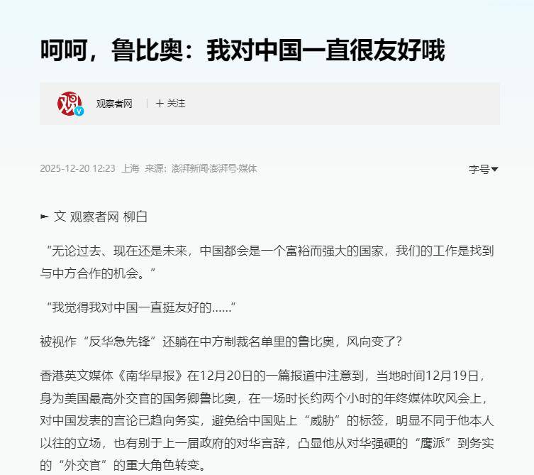 曾经嘴巴最硬的美国国务卿,最近竟然变了口风。2025年年底的一场记者会上,马可·鲁比奥面对镜头,语气平和地谈论中国,很多熟悉他过往风格的人差点没认出他。要知道,几年前,鲁比奥还在华盛顿代表强硬派声音,炒作涉疆问题时最为激烈,涉港法案也推得不遗余力。那个时候,他无疑是美国对华鹰派的代表人物,话语锋利、立场鲜明。