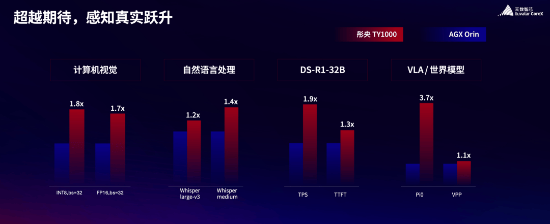 在实际测试中,无论是典型的CV任务,还是NLP推理,甚至是对参数规模达到32B的DeepSeek-R1模型进行推理,以及具身智能VLA模型及世界模型等场景,TY1000在多项指标上都展现出不弱于主流国际方案的表现。