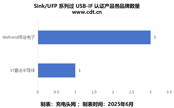 根据数据统计,通过USB-IF认证 Sink端芯片比较少,目前仅找到两家企业推出的芯片,其中伟诠电子有三款,意法半导体有一款。