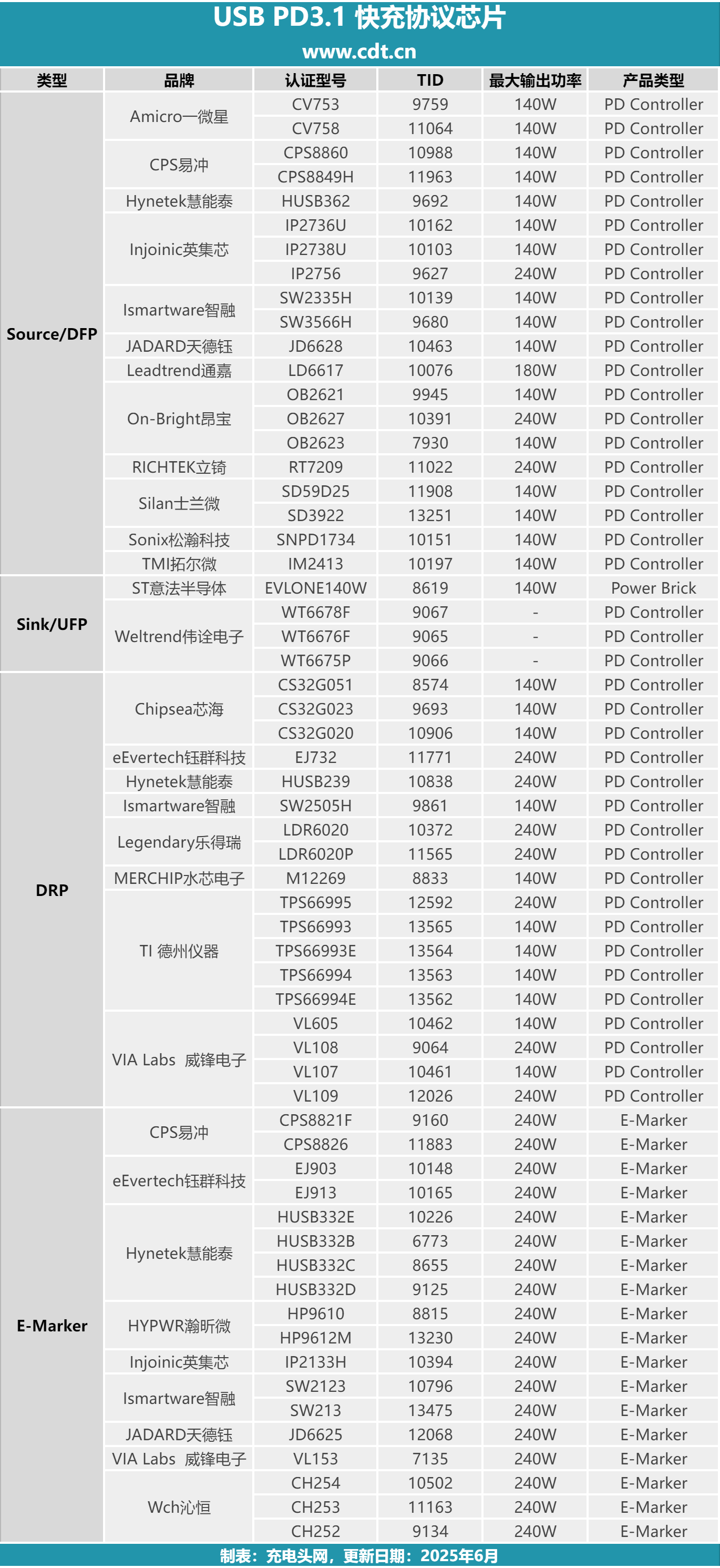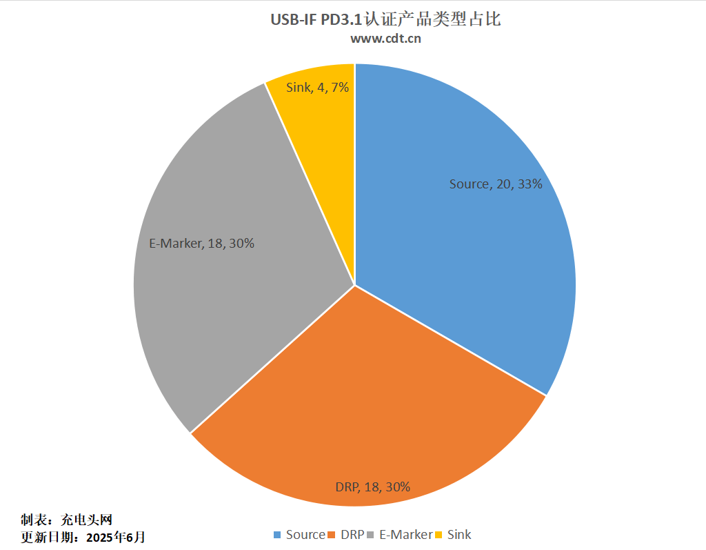 由于USB-IF官网查询不全,充电头网结合过往新闻以及USB-IF官网展示数据统计,截至2025年6月,共有42款协议芯片、18款e-marker芯片通过了PD 3.1认证。