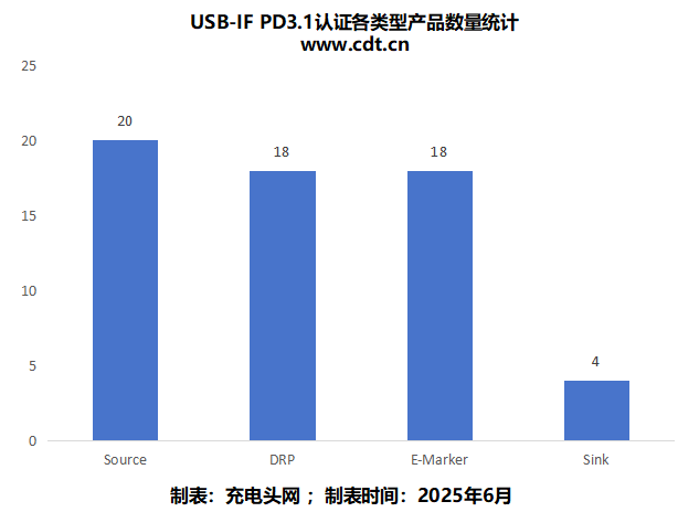 最新通过USB-IF PD3.1认证的产品中,细分下来,Source端协议芯片有20款最多,其次是E-Marker芯片及DRP双向芯片均有18款,Sink端芯片只有4款。随着更多芯片通过PD3.1认证,我们可以预见,未来支持PD3.1的充电器设备的数量也将随之增长,为快充市场注入新的活力。