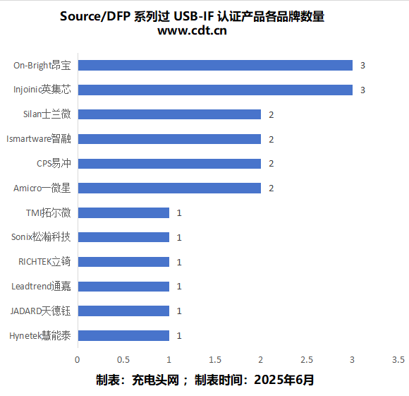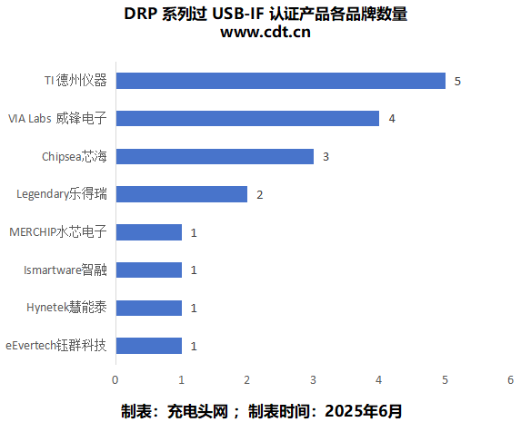 DRP芯片中,根据数据统计,通过USB-IF 认证最多的品牌是德州仪器,达到了5款;威锋电子第二,达到了4款;芯海第三,达到了3款;其余品牌分别为一至两款。