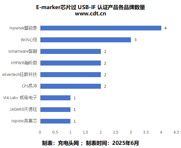 根据数据统计,通过USB-IF认证 E-Marker 芯片数量第一是慧能泰,数量有4款;沁恒第二,有3款;钰群科技、易冲、智融、瀚昕微并列第三,各有2款。