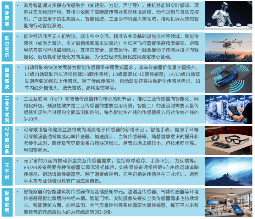 赋能千行百业转型升级:传感器的应用已渗透到每一个关键领域,其通过精准的数据感知,赋能各行各业实现精细化、智能化管理。