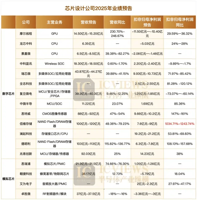 在本次统计的所有国产半导体公司中,佰维存储堪称最大赢家。其2025年扣非归母净利润同比增幅高达1034.71%-1243.74%,突破1000%的惊人增长幅度,在所有披露业绩的企业中遥遥领先。
