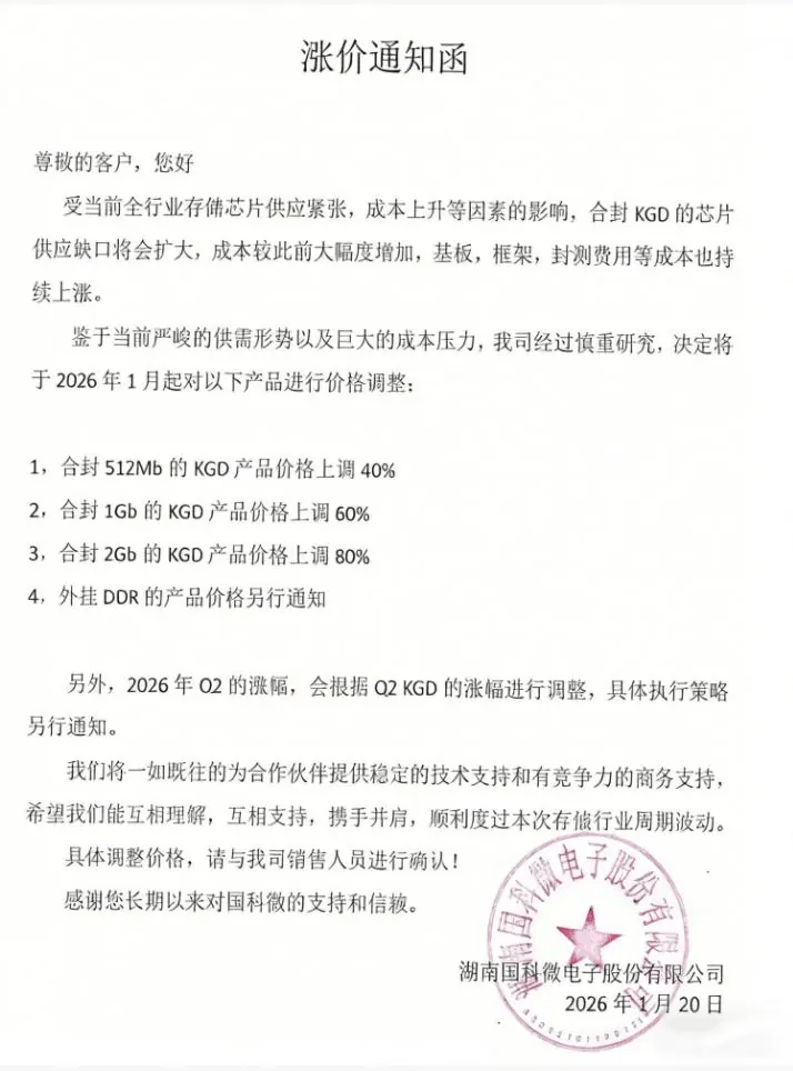据产业链消息,另一家半导体公司国科微也对客户发出涨价函,国科微宣布自1月起对合封512Mb的KGD(已知合格芯片)产品涨价40%,对合封1Gb的KGD产品涨价60%,对合封2Gb的KGD涨价80%,对外挂DDR的产品价格另行通知。