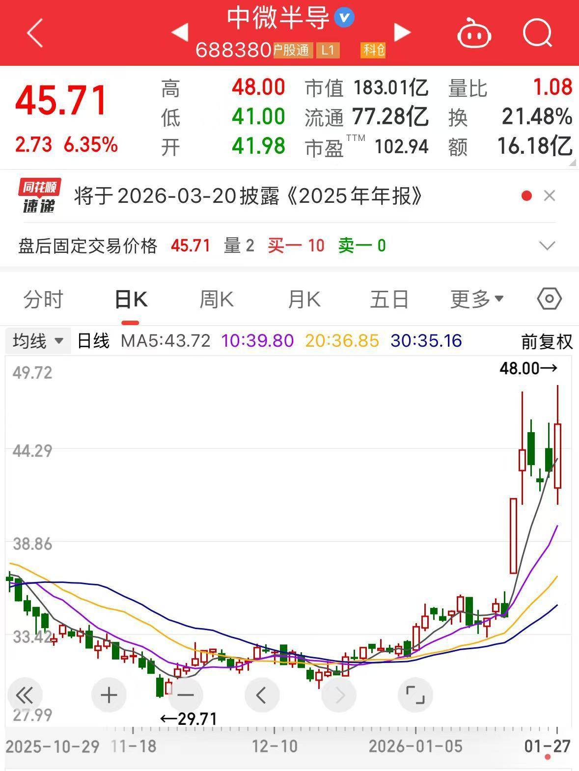 截至今日收盘,中微半导股价报45.71元/股,最新市值183.01亿元。