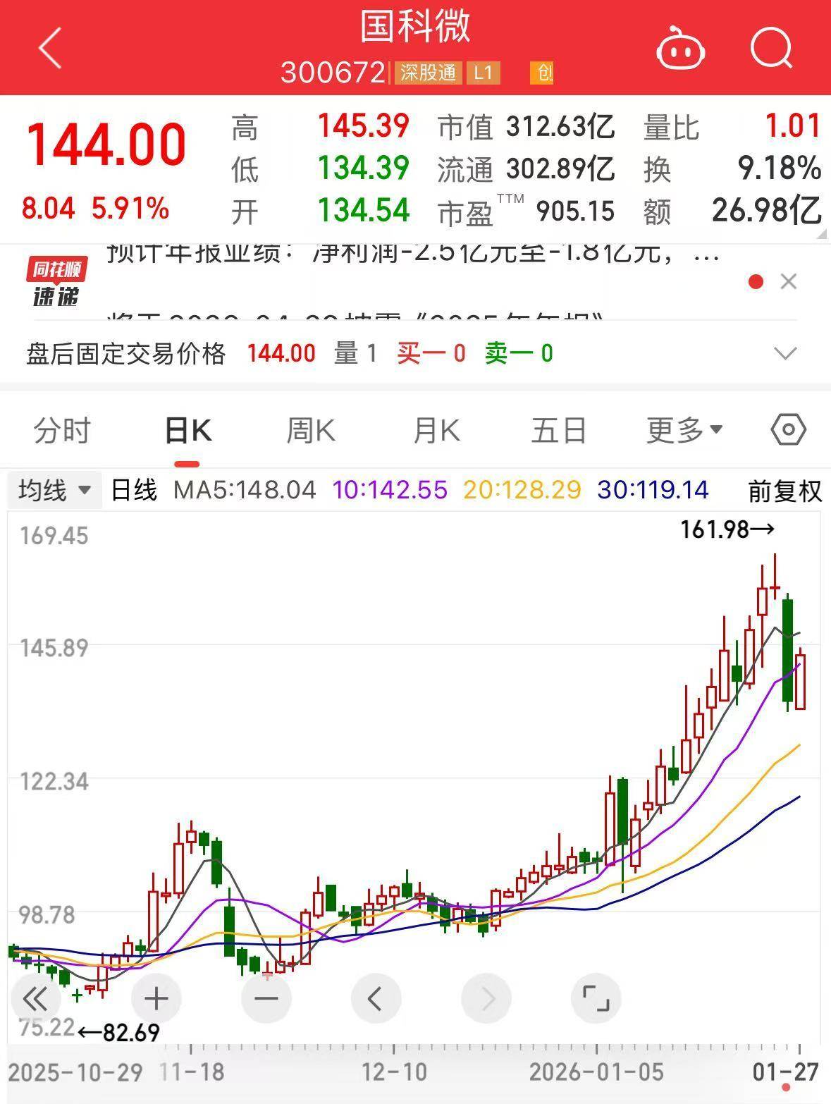 截至今日收盘,国科微(300672.SZ)股价报144元/股,最新市值312.63亿元。