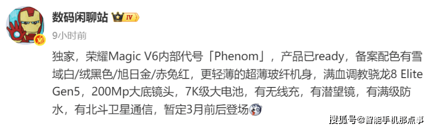 原因很简单,那就是有博主把荣耀Magic V6的底裤都给扒干净了,并且称新机的内部代号「Phenom」(现象级/杰出人才)。