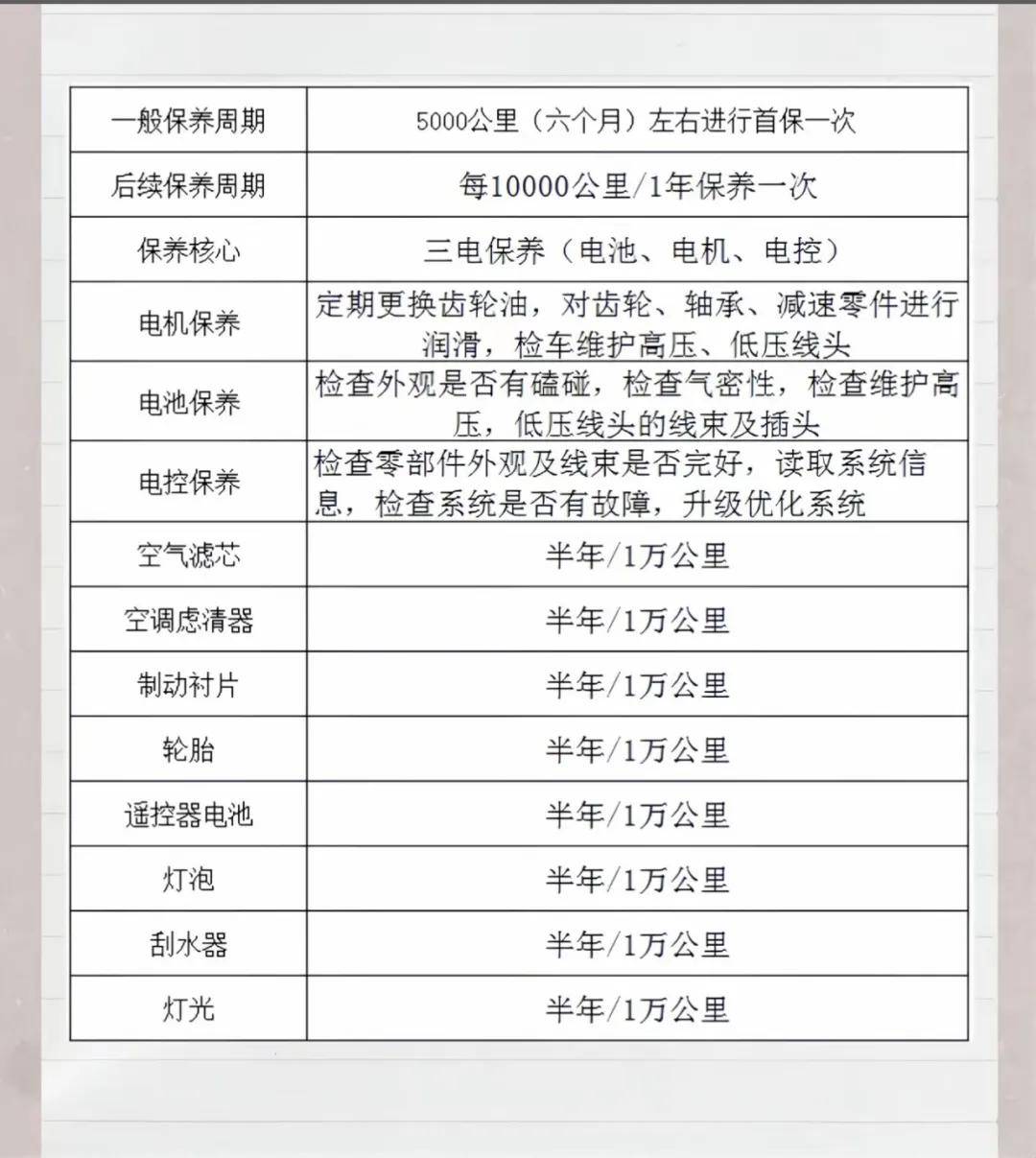 客服告诉他:电车当然也需要保养,但纯电车没有汽油发动机和变速箱这两大“精密机械”,少了最复杂、最贵的保养项目,主要是刹车、轮胎、底盘的检查,更换空调滤芯等。保养项目少了,频次也没那么多要求,保养支出就大幅下降了。