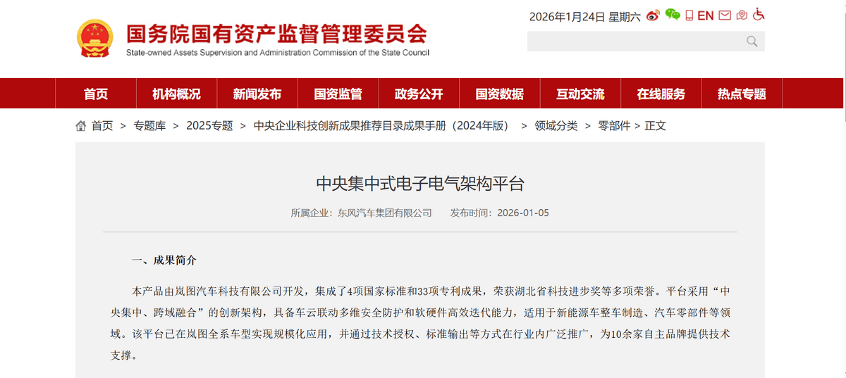 近日,国务院国资委发布《中央企业科技创新成果推荐目录成果手册(2024年版)》,其中岚图汽车自主研发的中央集中式电子电气架构平台成功入选,成为国家层面重点推荐的前沿科技创新成果之一,标志着岚图在智能电动汽车电子电气架构领域的技术实力和领先地位获得国家级权威认可,并给予推荐。