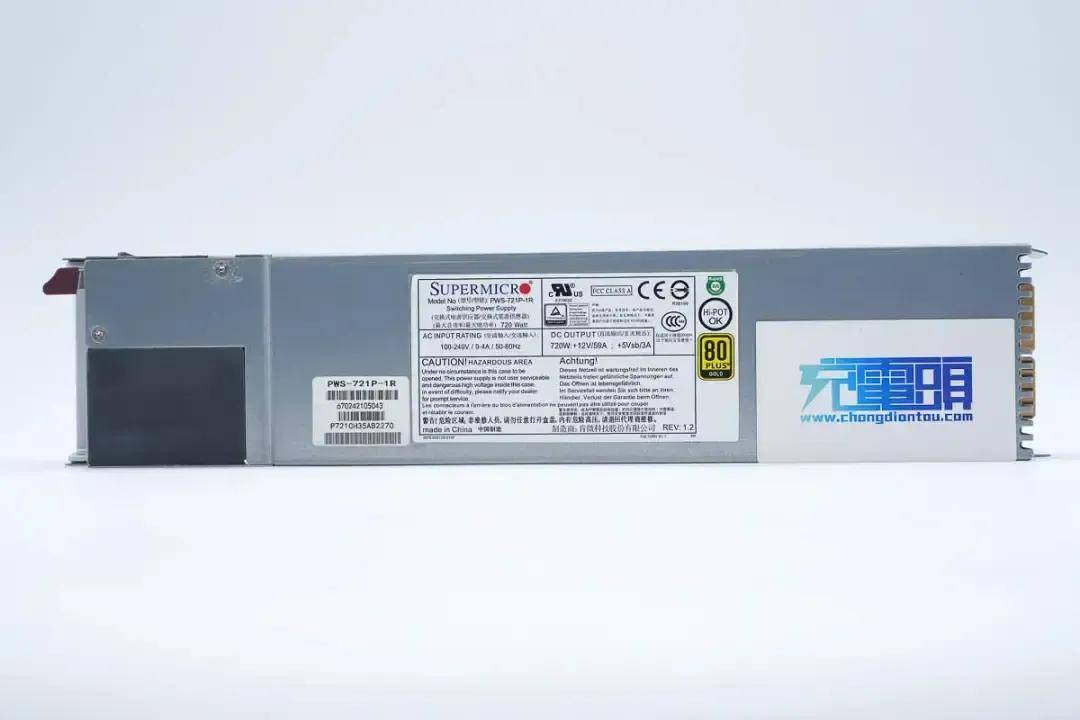 超微服务器720W冗余电源模块,型号为PWS-721P-1R,由肯微科技股份有限公司制造,电源模块采用PFC+移相全桥架构,具备80PLUS金牌转换效率。电源模块支持100-240V宽电压输入,具备12V输出和5V待机输出。