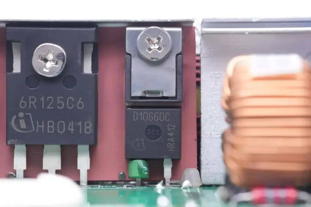 PFC开关管来自英飞凌,丝印D0665C6,型号IDH06G65C6,为碳化硅二极管,规格为650V 6A,采用TO220-2封装。