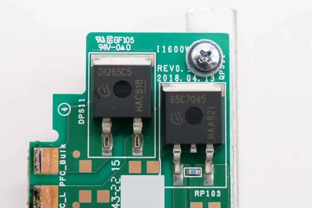 左侧PFC整流管来自英飞凌,丝印D1265C5,型号IDK12G65C5,为碳化硅二极管,规格为650V 12A,采用TO263-2封装。