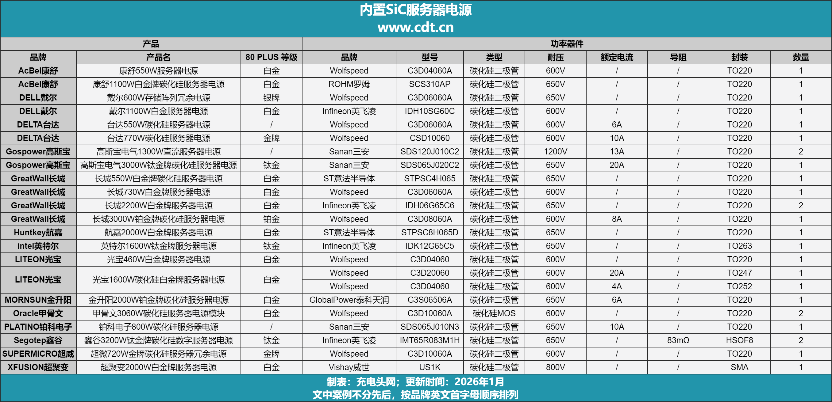 在各地逐步严苛的能效法规以及运营成本的双重推动下,服务器电源正加速导入碳化硅器件。其凭借更低开关损耗与更强高温可靠性,同时可以显著提升整机效率并提升功率密度。基于这一趋势,我们近期拆解了数十款碳化硅服务器电源,借此梳理服务器电源领域的碳化硅选型规律。