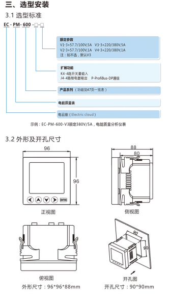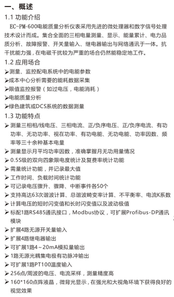EC-PM-600电能质量分析仪表采用先进的微处理器和数字信号处理技术设计而成。集合全面的三相电量测量、显示、能量累计、电力品质分析、故障报警、开关量输入、继电器输出与网络通讯于一体。抗干扰能力强,在电磁干扰较为严重的场合仍然能稳定地工作。