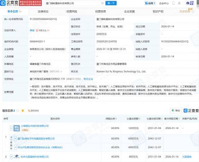 企查查APP显示,近日,厦门燧屿星眸科技有限公司成立,法定代表人为唐锋,注册资本为2000万元,经营范围包含:人工智能应用软件开发;人工智能基础软件开发;人工智能硬件销售;智能机器人销售等。企查查股权穿透显示,该公司由弘信电子(300657.SZ)旗下上海燧弘华创科技有限公司、杭州北冥星眸科技有限公司共同持股。