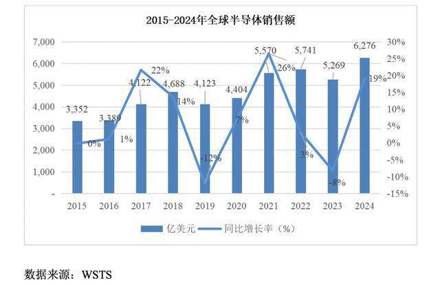 随着互联网时代的开启,在人工智能、消费电子、汽车电子、物联网等下游新兴应用领域的强劲需求带动下,半导体行业自2015年以来便进入较长的上升周期。据世界半导体贸易统计组织(WSTS)测算,2024年全球半导体销售额达到了6,276亿美元,同比增长19.10%,首次突破6,000亿美元。人工智能服务器和相关芯片的需求高涨,成为市场增长的核心驱动力。2024年半导体市场迎来了显著复苏,预计2025年将继续保持增长态势。