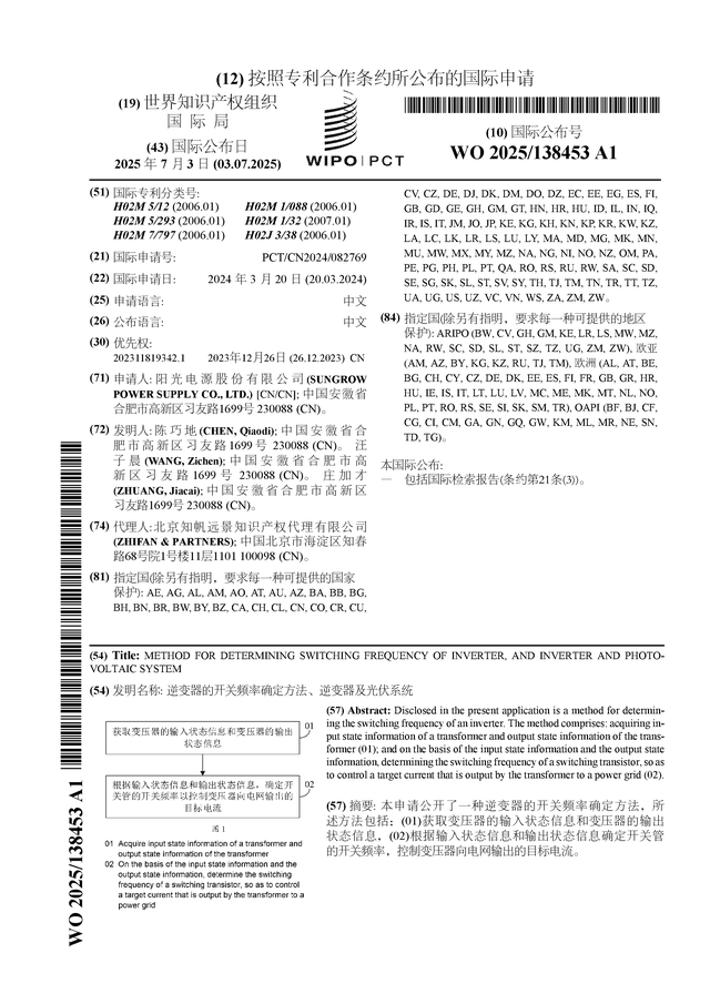 证券之星消息,根据企查查数据显示阳光电源(300274)公布了一项国际专利申请,专利名为“逆变器的开关频率确定方法、逆变器及光伏系统”,专利申请号为PCT/CN2024/082769,国际公布日为2025年7月3日。