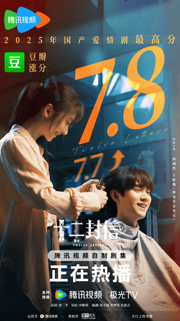 也有探索类型创新的口碑黑马,如拿下2025年国产爱情剧豆瓣最高开分并已上涨至7.8分的《十二封信》,以“跨时空通信”的设定在青春爱情故事中融入悬疑和奇幻元素,靠自来水用户走出一条逆袭上扬的弧线。