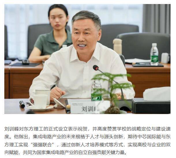 刘训峰在该校时表示:“集成电路产业的未来根植于人才与源头创新,期待中芯国际能与东方理工实现‘强强联合’。”