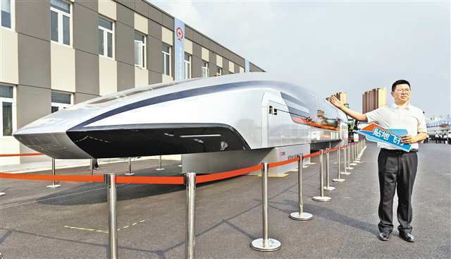 7月9日,在国家铁道试验中心展区,一名男子与国内首辆超导电动高速磁浮样车合影留念。