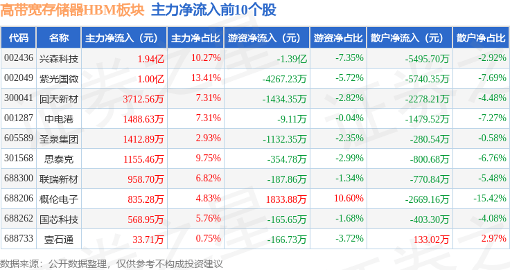 从资金流向上来看,当日高带宽存储器HBM板块主力资金净流入3316.16万元,游资资金净流入6348.57万元,散户资金净流出9664.73万元。高带宽存储器HBM板块个股资金流向见下表: