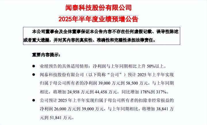 7月14日,闻泰科技发布2025年半年度业绩预告,预计2025年上半年实现归属于母公司所有者的净利润3.9亿元至5.85亿元,同比增长178%至317%。业绩增长主要得益于半导体板块市场需求回暖、降本增效策略深化及供应链优化,业务收入和毛利率均同比提升。