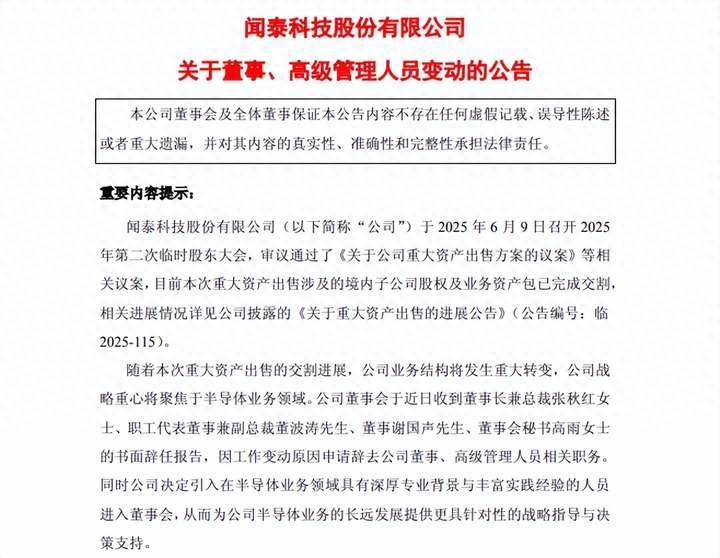 闻泰科技正经历一场从高层人事调整到核心业务重塑的全面变革。公司于7月15日发布公告,宣布董事长兼总裁张秋红、职工代表董事兼副总裁董波涛、董事谢国声以及董事会秘书高雨等多位核心管理人员因工作变动原因集体辞任。